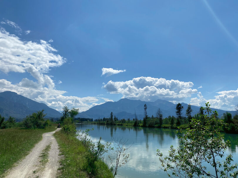 Ab Sindelsdorf treten wir mit Blick auf die Benediktenwand (1800 Meter) im Osten und die bayerische Hochalpenkulisse im Süden in die Pedale. Das Naturerlebnis steht jetzt eine Stunde lang im Vordergrund. Wir lassen uns vom Wetter und von den Wegweisern vor Ort leiten, fahren auf eigene Faust auf landwirtschaftlichen Pfaden durch die Landschaft der Loisach-Kochelsee-Moore, ohne auf asphaltierte Wege entlang der Autorouten angewiesen zu sein. Wasserschrauben und andere Seegräser im kleinen Sindelsbach begeisterten uns genauso wie die realen landschaftlichen Motive der expressionistischen Bilder, die man hier mehr synästhetisch durchlebt und empfindet als nur vergleichend aufruft. Die letzten Kilometer nach Kochel streifen wir direkt an der Loisach entlang – auf einem schmalen Pfad, der nur an trockenen Tagen und mit Mountainbikereifen zu empfehlen ist.