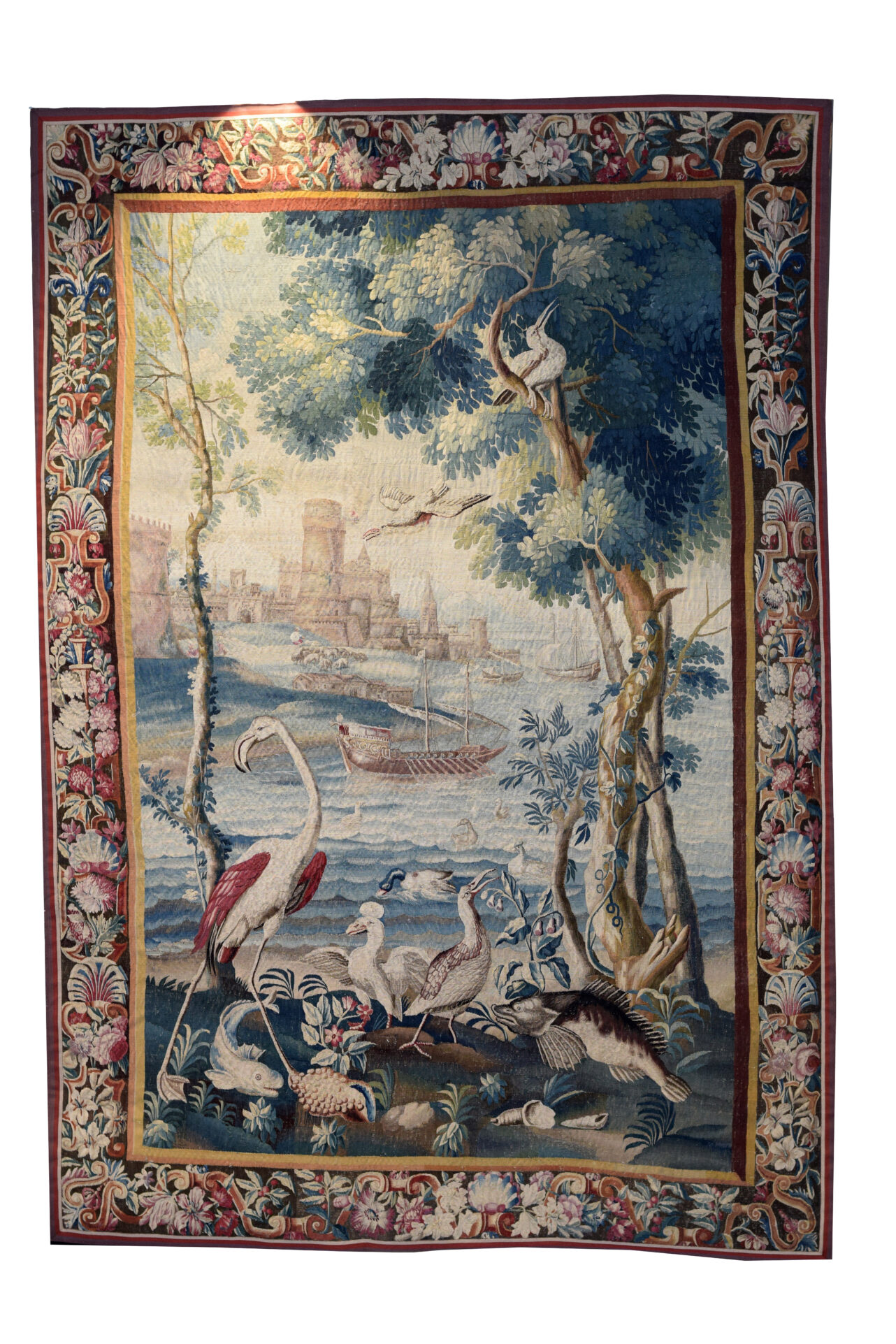 Er stammt demnach aus einer französischen Manufaktur und zeigt das Ufer einer Seebucht mit Wasservögeln. Bis 1936 habe er sich in der Sammlung von Goldschmidt-Rothschild in Frankfurt am Main befunden. Dann habe er ihn unter dem Druck der Verhältnisse versteigern lassen müssen.