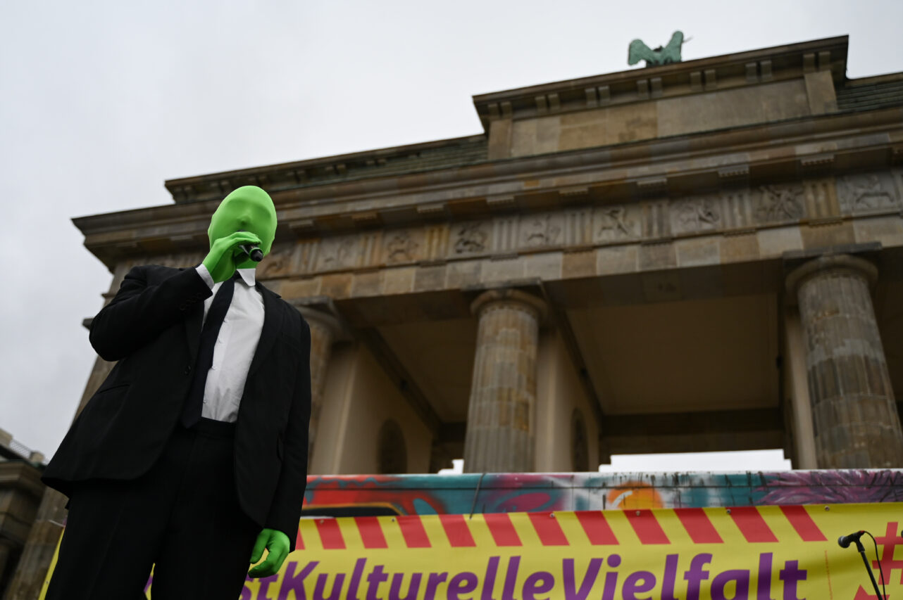 Berlin ist sauer! Und das zeigen am späten Mittwochmorgen vor dem Brandenburger Tor unter dem Motto #BerlinistKultur rund 3000 Menschen (laut Veranstalter) mit Nachdruck. Reagiert wird auf die geplanten Kürzungen von 10 Prozent im Berliner Kulturetat von 2025. Entsprechend motiviert finden sich, trotz frischer Temperaturen, gefühlt alle Kulturhäuser der Hauptstadt zusammen. Neben der mobilen Bibliothek des VÖBB schwingen die kleinen und großen Theater, Opern, Musikschulen, Kunsträume oder die Berliner Clubkomission ihre Flaggen und Plakate. Zum schnellen Frustabbau sorgte das „SK Freie Szene“ und öffnete die Türen ihres Vans, der ein buntes Bällebad enthielt. Auch Tauben demonstrieren mit: Mit starrdreinblickenden Vogelkopfmasken marschieren unbekannte Mitstreitende unter dem Slogan „Tauben sind Kultur“ durch die dicht gedrängte Menge und lassen selbst die älteren Fraktionen mit schmunzelnder Miene zum Handy zücken.