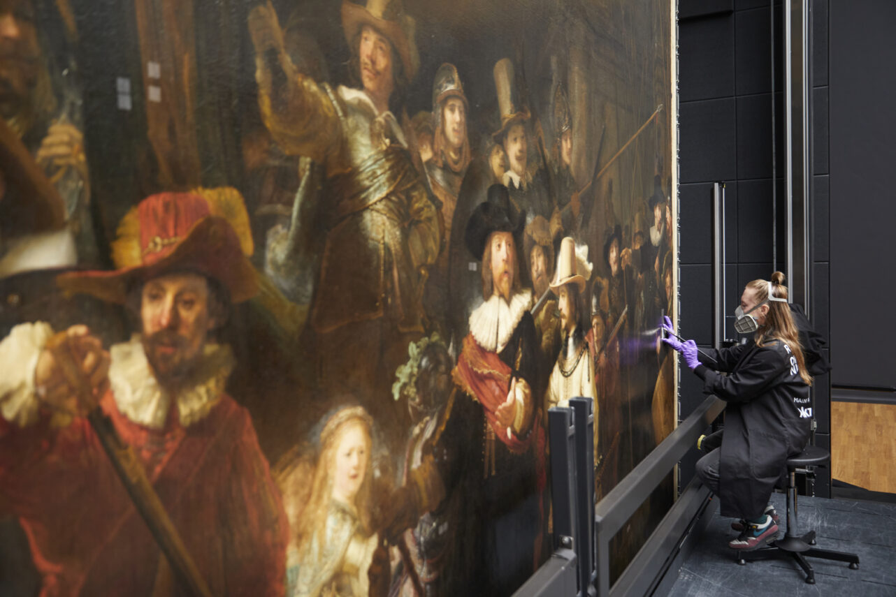 Acht Restauratoren werden zunächst die alten Firnis-Schichten mit mikroskopischer Präzision entfernen. Sie nutzen dafür besondere Tücher, die mit Lösungsmittel getränkt wurden. Zentimeter für Zentimeter bewegen sie sich von den Seiten des Bildes bis ins Zentrum. Die letzte Lackschicht war nach einem Anschlag vor fast 50 Jahren angebracht worden, sagte Restauratorin Esther von Duijn. „Das Gemälde hat viel mitgemacht.“