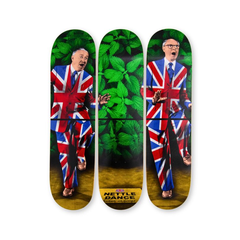Wer sich als Neujahrsvorsatz ein neues cooles Hobby zulegen möchte, kann sich vielleicht mit einem der kunstvollen Skateboards von Gilbert und George motivieren. Auf den Brettern befinden sich unterschiedliche Motive der zwei britischen Künstler und bringen nicht nur das Herz zum Springen. Zu kaufen gibt es die limitierten Editionen auf der Website von „The Skate Room“.