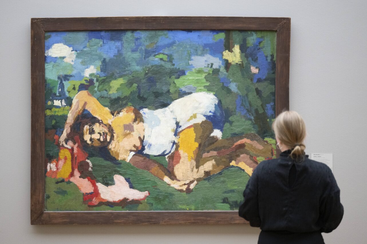 Die Dresdner Gemäldegalerie mit den Bildern Alter Meister inspirierte den Maler. In „Sommer I“ sind der Körper einer liegenden, teils bekleideten Frau ebenso wie die Landschaft im Hintergrund aus großzügigen, kontrastierenden, leuchtenden Farbflächen modelliert. (dpa)