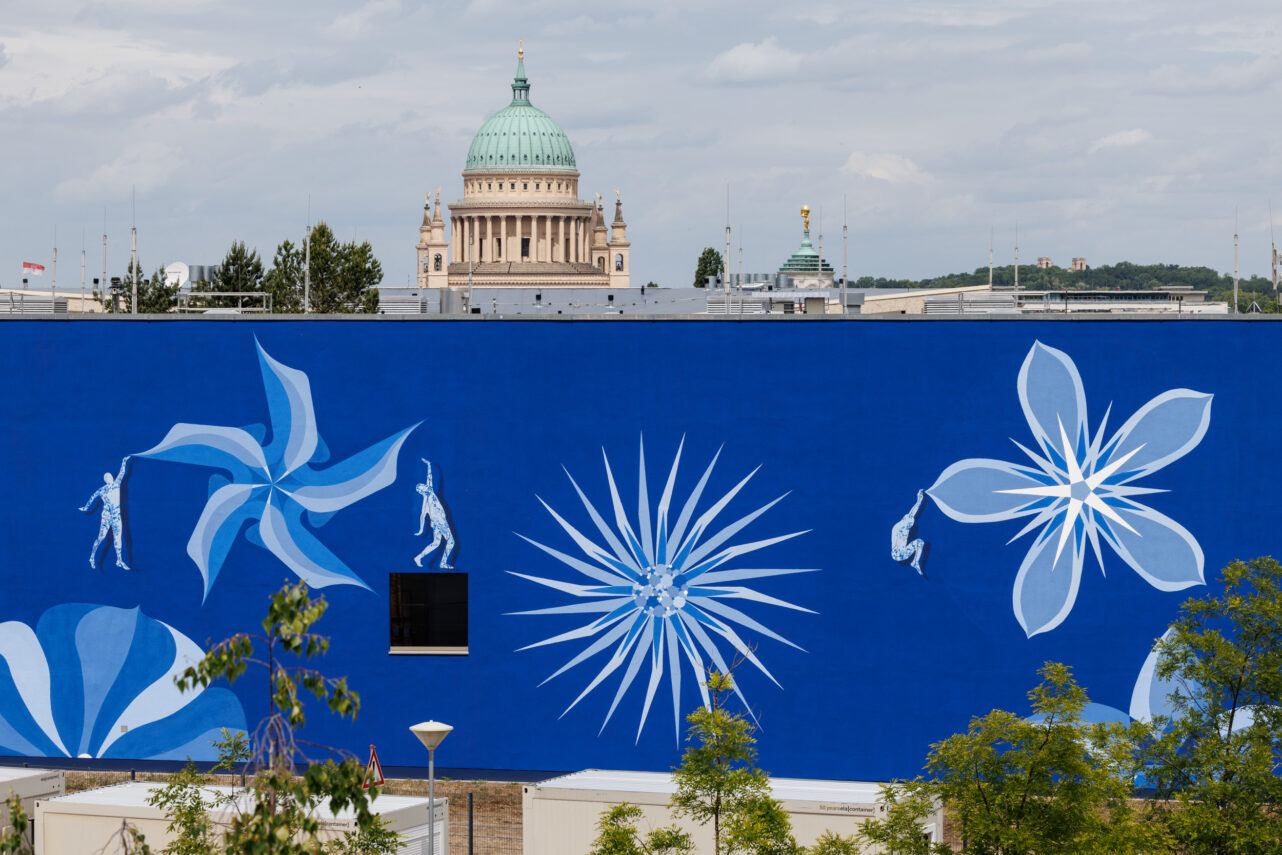 Von der Terrasse des Minsk in Potsdam hat man einen fantastischen Blick über die Stadt – wäre da nicht die Südfassade des Hallenbades, die trist zwischen Museum und Hauptbahnhof emporragt. Nun haben das Kunsthaus, die Hasso Plattner Foundation und die Stadtwerke Potsdam gemeinsam eine Lösung gefunden, die sich sehen lassen kann: Sie luden den Künstler Robin Rhode ein, ein großformatiges Wandbild zu gestalten, das sich spielerisch ins Stadtbild einfügt. Für sein Kunstwerk „Der Botanische Garten“ verwendete der Südafrikaner das 1706 in Berlin entdeckte Pigment Preußisch Blau, das auch im benachbarten Sanssouci und dem Neuen Palais zu finden ist. Als Inspiration für seine Arbeit diente dem 49-jährigen Künstler Goethes Text „Die Verwandlung von Pflanzen“ von 1750.