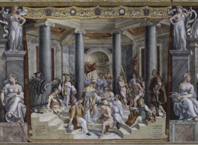 Der Saal des Konstantin ist der größte und für offizielle Empfänge vorgesehene Raum im Apostolischen Palast. Die Wandgemälde, die vier Episoden aus dem Leben des Kaisers darstellen, wurden nun aufwendig restauriert