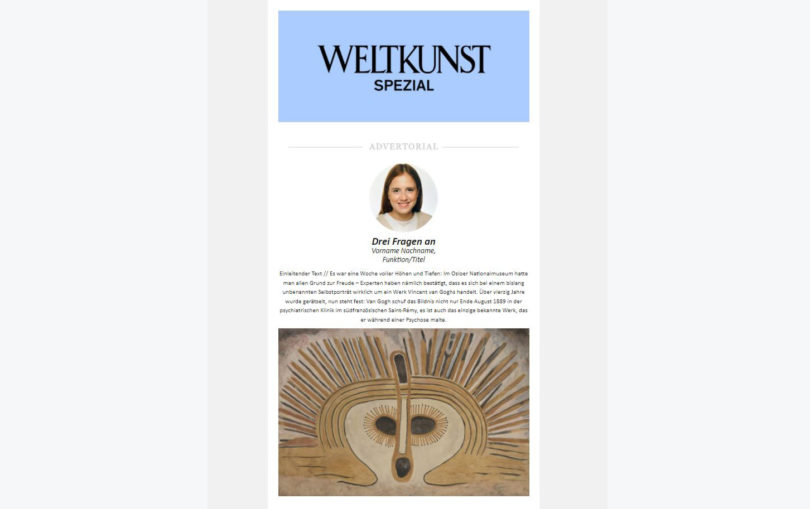 Profitieren Sie mit dem Sondernewsletter von der WELTKUNST Abonnent:innen-Reichweite – wir bieten Ihnen maßgeschneiderte Platzierungsmöglichkeiten, um mit einer attraktiven Zielgruppe direkt zu kommunizieren.