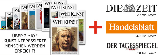 Wir realisieren regelmäßig WELTKUNST Spezialausgaben zu großen Ausstellungen oder auch Reisedestinationen. Diese Hefte werden sowohl der ZEIT als auch dem HANDELSBLATT und dem TAGESSPIEGEL beigelegt. Über 3 Millionen kunstinteressierte Leserinnen und Leser werden durch diese inhaltlich und gestalterisch hochqualitativen Hefte angesprochen.