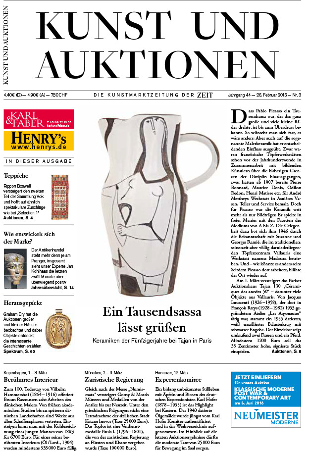 KUNST UND AUKTIONEN, die Kunstmarktzeitung aus dem Hause der ZEIT, ist seit über 40 Jahren die wichtigste Fachzeitung im deutschen Kunstmarkt. KUNST UND AUKTIONEN ist der aktuelle unentbehrliche Ratgeber, Vermittler und Deuter beim Kauf und Verkauf von Kunst. Ab dem 30.10.2015 erschien die neue KUNST UND AUKTIONEN, aufgeräumter in einer hochwertigen Optik, um der wachsenden Bedeutung von Wissensbedarf im Kunstmarkt Rechnung zu tragen. Unter anderen neu: Eine Doppelseite mit einem Jahresrückblick eines Experten zum Thema des jeweiligen Sammelgebietes einer KuA-Ausgabe stärkt das „Auktionsbuch“. Neue Themenumfelder wie der marktbezogene Rückblick auf Sammelgebiete und Informationen über den Kauf von Kunst im Internet, bieten dem Leser attraktive und zeitgemäße Themen. Chefredakteurin ist Frau Dr. Lisa Zeitz.