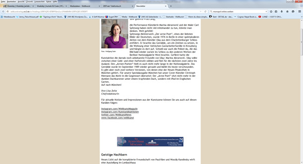 Monatlich informiert Weltkunst-Chefredakteurin Dr. Lisa Zeitz unsere Newsletter-Abonnenten über die Themen der kommenden Weltkunst Ausgabe und über die wichtigsten Termine des Monats. Ca. 7.500 Leser lesen diesen Newsletter mit großem Interesse. Mit einem Banner im Newsletter erreichen Sie einige unserer Abonnenten bereits vor Erscheinen der neuen Print-Ausgabe.
