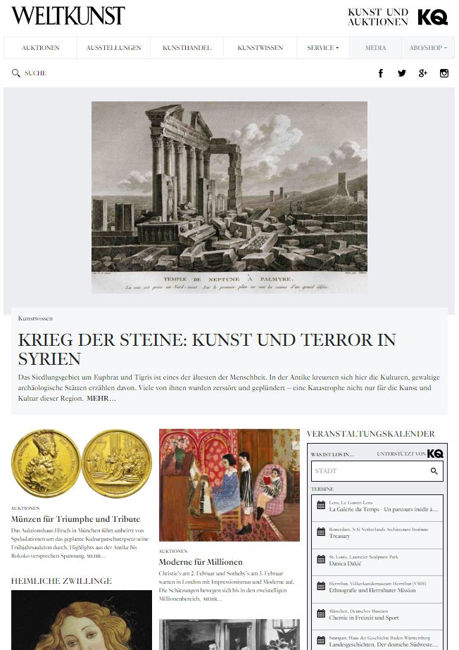 Weltkunst Online ist die neue digitale Plattform für eine erweiterte Zielgruppe von Kunstexperten, Kunstsammlern und Kunstentdeckern. Neben aktuellen Informationen zum Kunstmarktgeschehen und Hintergrundberichten zu vielen verschiedenen Sammelgebieten finden unsere Online-Leser Deutschlands größten Kunstkalender mit mehr als 15.000 Terminen. Ein Expertenverzeichnis und verschiedene Städteführer bieten Service und Orientierung im Kunstmarkt.