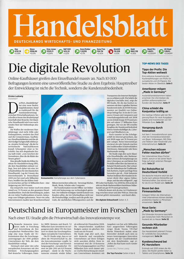 Das Handelsblatt ist Leitmedium der Wirtschaftselite und die größte Wirtschafts- und Finanzzeitung in deutscher Sprache. 290.000 Entscheider lesen lt. LAE 2015 täglich das Handelsblatt. Jeden Freitag beleuchten Kenner im Handelsblatt-Kunstmarkt Auktionen und Messen, Galerie- und Museumsausstellungen im In- und Ausland. Sie erfahren alles über Rekorde, Preise und Hintergründe. Ein verlässlicher Wegweiser im Dschungel Kunst. Freitägliche Pflichtlektüre für die komplette Kunstbranche.