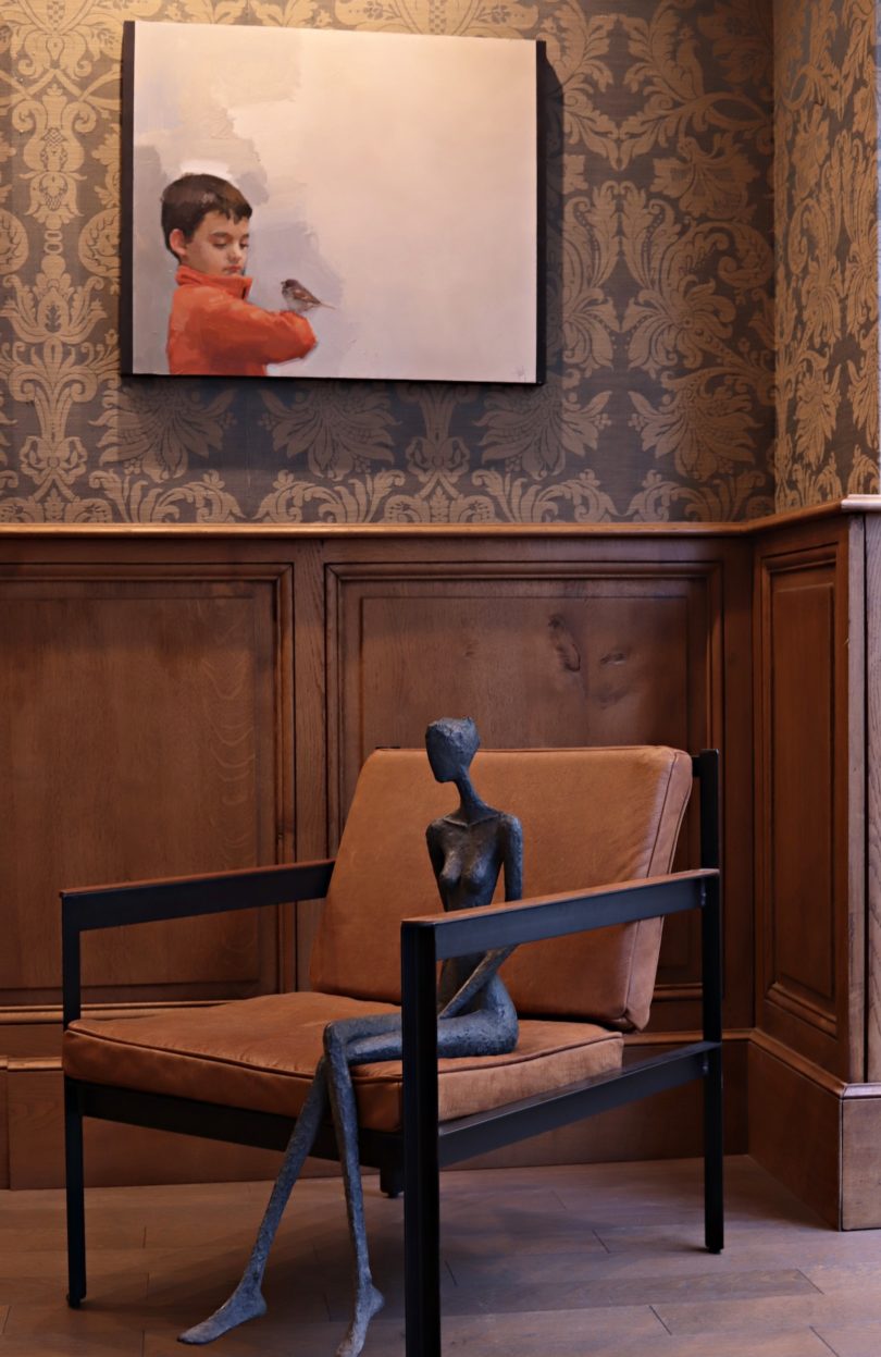 Auf dem Ledersessel hat es sich eine Bronzeskulptur Sylvie Mangauds gemütlich gemacht - darüber hängt das Ölgemälde „Mosca (the fly)“ (2021) von Carlos Tardez. © Galerie Géraldine Banier, Foto: Deborah Rakers