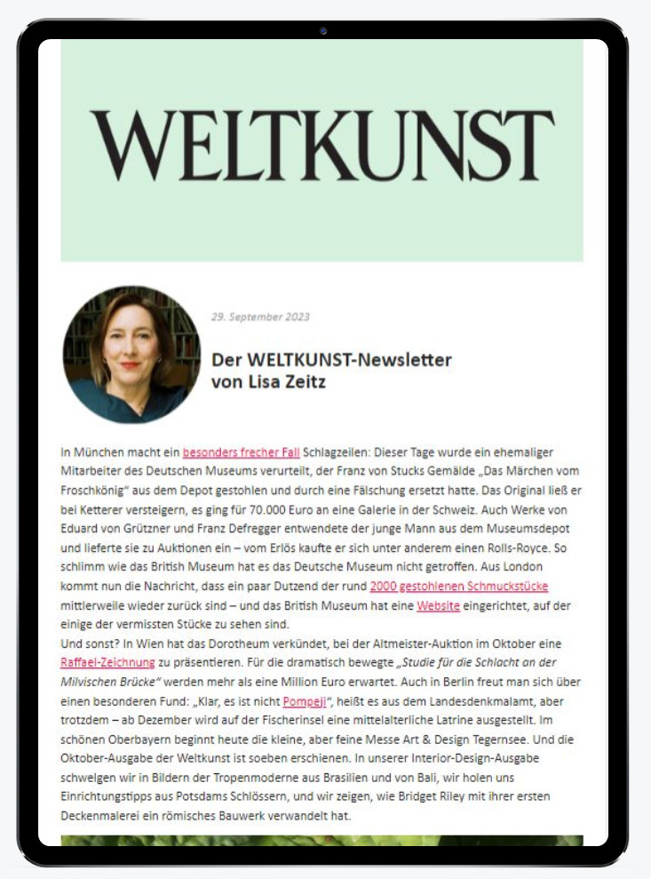 Die Newsletter-Abonnent:innen profitieren damit von ihrem Insider-Wissen. Der neue Newsletter informiert nicht nur umfassend, er regt auch zum aktiven Ausprobieren an – zum Besuch von Museen, zum Mitsteigern bei Auktionen und zum Lesen und Stöbern. Wenn Sie nicht schon längst zu den Abonnent:innen gehören, überzeugen Sie sich selbst!
