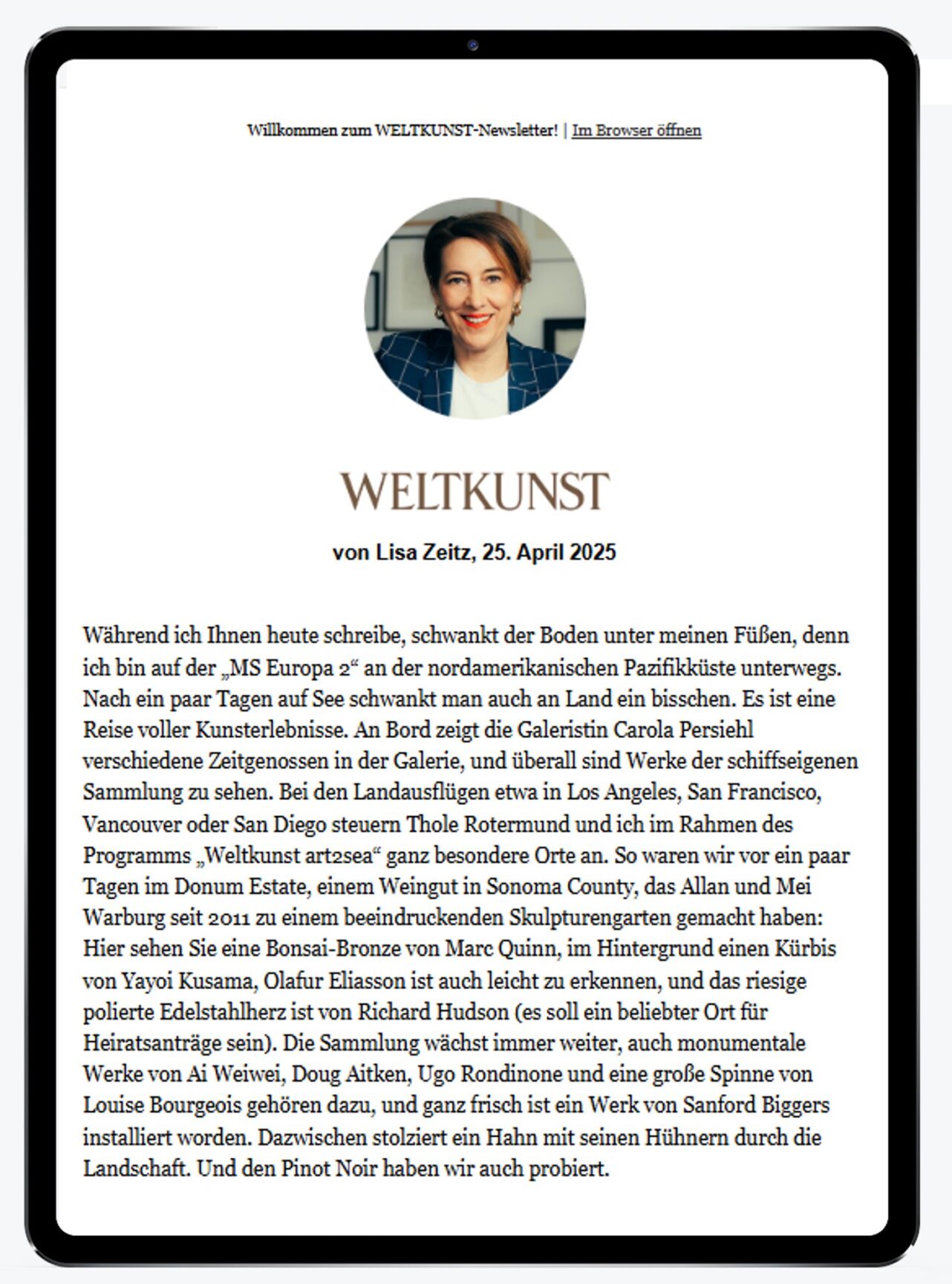 Die WELTKUNST wird persönlich – Lisa Zeitz nimmt Sie mit.