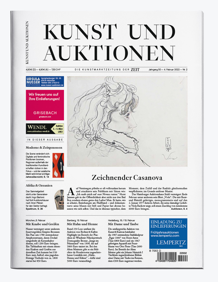 KUNST und AUKTIONEN ist die deutschsprachige Fachzeitung für den Auktionsmarkt und dies seit nahezu 50 Jahren. Das absolute Expertenwissen bei den Autor:innen macht sie zu einem qualitätvollen Heft mit Spezialwissen für den Markt. Sie gibt Orientierung und ist der aktuelle unentbehrliche Ratgeber, Vermittler und Deuter bei Kauf und Verkauf von Kunst.