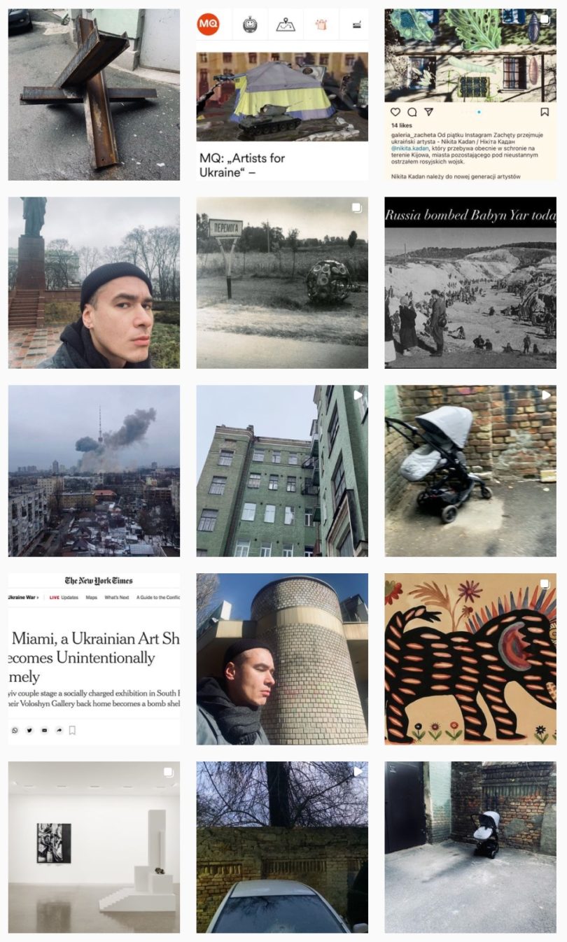 Eigentlich wäre der 40-jährige Kiewer Künstler Nikita Kadan jetzt in einem Artist-in-Residence-Programm der Kunsthalle Krems und würde sich mit dem russischen Futuristen Welimir Chlebnikow beschäftigen. Doch Kadans Flug wurde bei Kriegsausbruch gestrichen, und jetzt verbringt er die meiste Zeit in einer zum Luftschutzbunker umfunktionierten Kiewer Galerie. Diese Woche übernimmt er den Instagram-Account der Nationalen Kunstgalerie Zacheta in Warschau und zeigt dort sowohl Kunstwerke der vergangenen Jahre als auch Bilder seiner Gegenwart in Kiew.