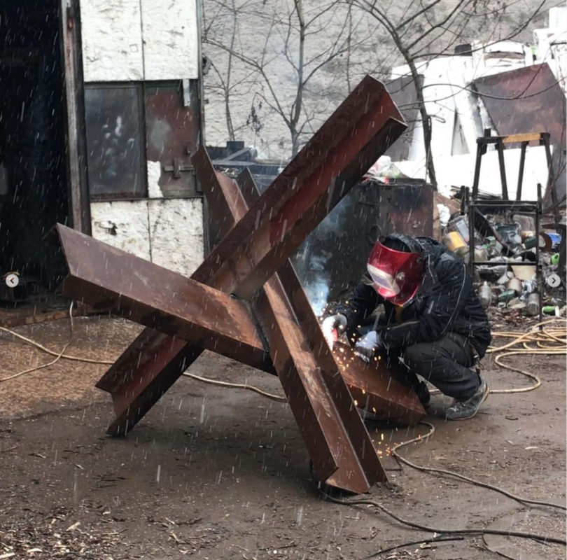 Am 20. Februar reiste der Berliner Maler in seine ukrainische Heimat, um eine Soloausstellung in der WT Foundation in Kiew zu eröffnen. Das Opening war für den 24. Februar geplant, dem Tag, an dem der Krieg ausbrach. Jetzt ist Volo Bevza in Lwiw und arbeitet freiwillig für den Heimatschutz. „Ich habe gar keine Erfahrung mit Waffen und Militär“, sagt er, „und daher hoffe ich, dass ich nicht in der ersten Reihe eingezogen werde.“ In den vergangenen Tagen hat er gemeinsam mit einer Gruppe Panzerabwehrigel geschweißt, die Künstlerin Victoria Pidust hat ihn und seine Kollegen dabei fotografiert. „Sieht aus wie ein Kunstwerk, ist aber keins“, schreib er lapidar in seiner Instagram-Story zu den Antipanzerbarrieren, die auch Werk Richard Serras sein könnten. In seinem Account ruft er zu Spenden für die Territorialverteidigung in Lwiw, Nikopol und Wyschnewe auf.