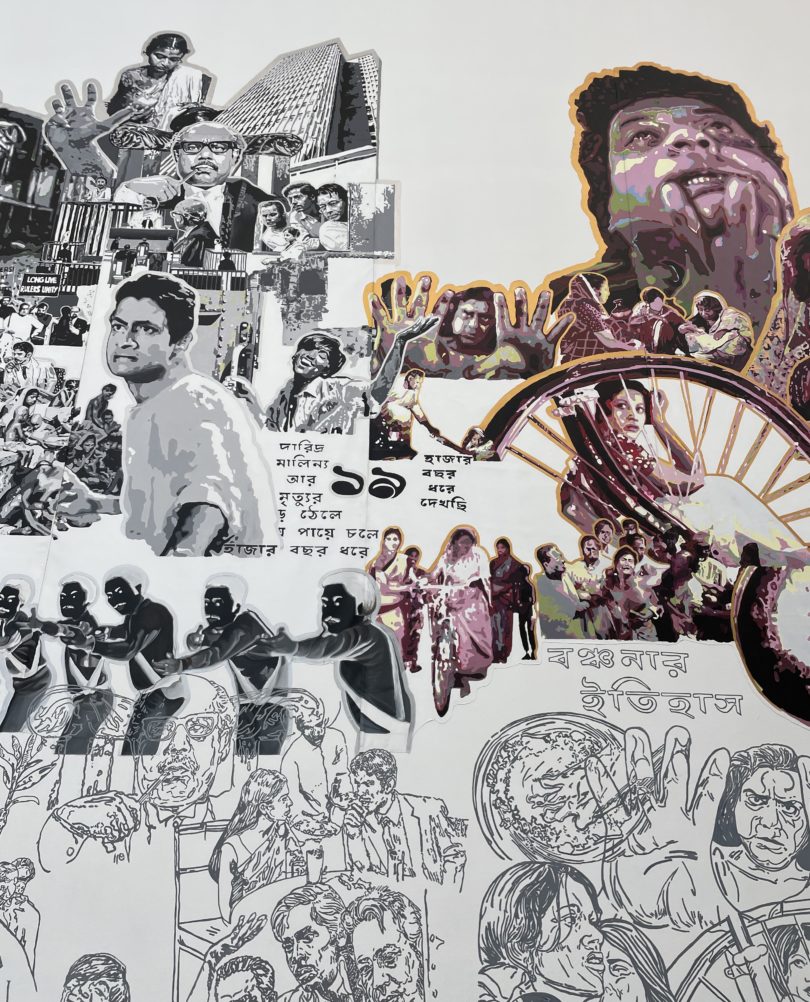 Auf dem großen Wandbild sind Szenen aus alten bengalischen Filmen zu den Themen Nahrung, Hunger und Krieg dargestellt. © Foto: Clara Zimmermann
