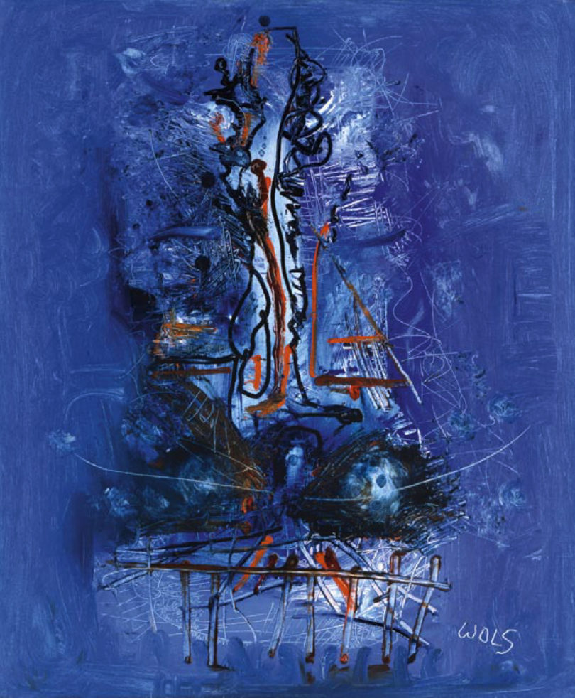 Die „Komposition Champigny“ von Alfred Otto Wolfgang Schulze, genannt Wols, entstand 1951. Doch schaut man sie sich in der neuen Schau im Potsdamer Museum Barberini heute an, überkommt einen das Gefühl, dass sie zeitgemäßer kaum sein könnte. Wie lebt man, nachdem die Welt sich fast zerstört hatte? Wie macht man weiter, wenn man das Vertrauen in die Menschheit verloren hat? Was lässt sich fühlen, wenn die Lava unvorstellbarer Traumata unablässig in den Alltag quillt? Wie malt man am Nullpunkt der Geschichte? Vielleicht haben wir heute angesichts der erschütternden Weltlage wieder eine Ahnung davon, wie es wirklich war, damals, als der Zweite Weltkrieg „wie ein schwerer Leichnam in unseren Armen“ lastete, wie Simone de Beauvoir einmal schrieb. Und dennoch Hoffnung und dieses eigentlich so schöne Blau.