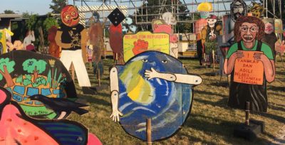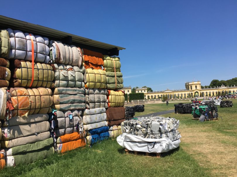 Die Kino-Installation „Return to Sender“ des Nest Collective aus Nairobi, Kenia fällt den Besuchern der Documenta Fifteen in den Kasseler Parkauen schon aus einiger Distanz auf. Aus der Nähe zeigt sich, dass es sich bei den bunten Stoff- und Kunststoffballen um Abfallpakete handelt, die das Kollektiv aus Kenia zurück nach Europa importiert hat.