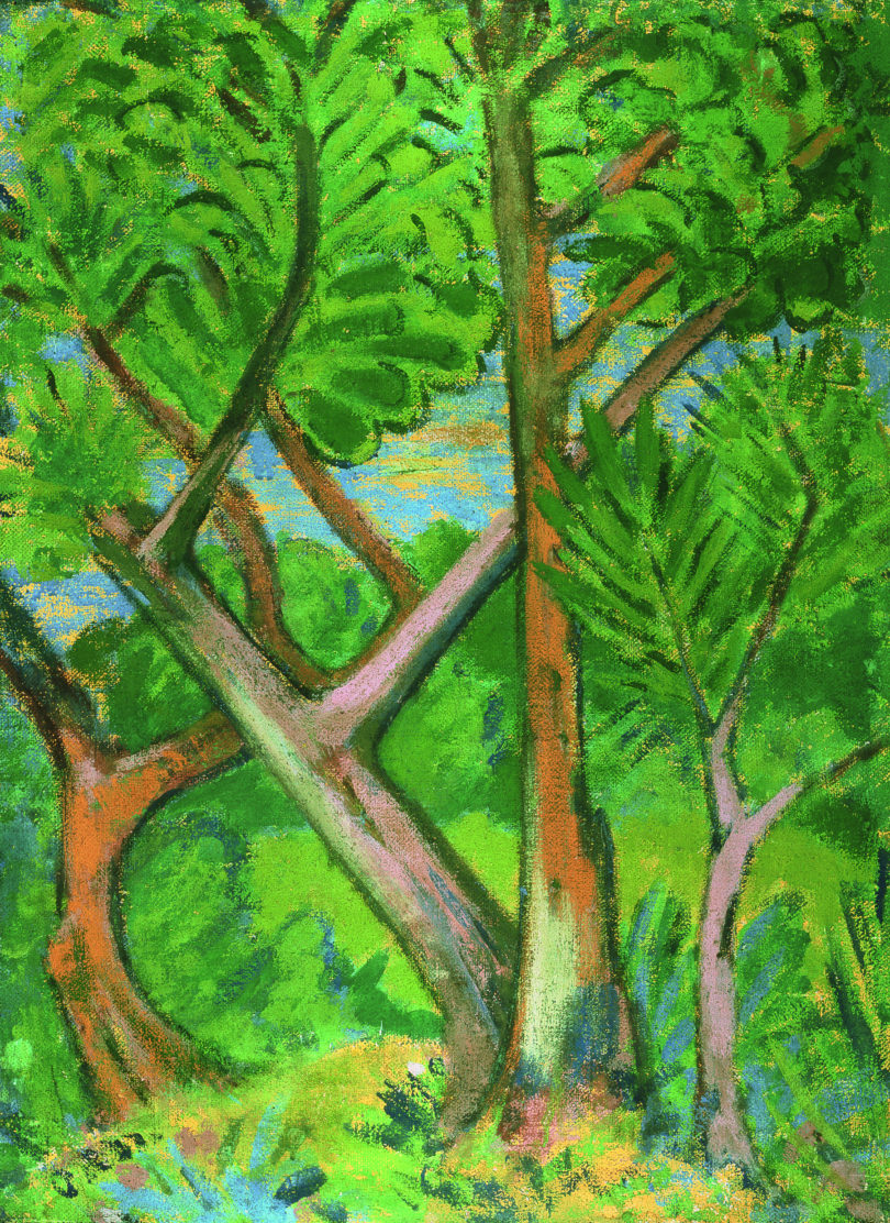 Zum Wald ist in Deutschland eigentlich alles gesagt, aber offensichtlich längst noch nicht alles gezeigt: Die Kunst arbeitet sich an dem nationalen Mythos, der früh im 19. Jahrhundert entstand, weiterhin gerne ab. Ob Otto Mueller seine „Waldlandschaft“ im Jahr 1921 als Ort zum sommerlichen Verlorengehen imaginiert oder Andreas Mühe 2015 in „Gespensterwald“ die Rückenfiguren der Romantik auf ironische Weise zitiert – der Baumbestand wirkt stets bedeutungsschwanger und unergründlich. An die Fragilität des Ökosystems erinnert dann David Claerbout mit dem Video „Wildfire (meditation on fire)“ von 2019/2020: Die Flammen eines Waldbrands verzehren ein computergeneriertes Gehölz.