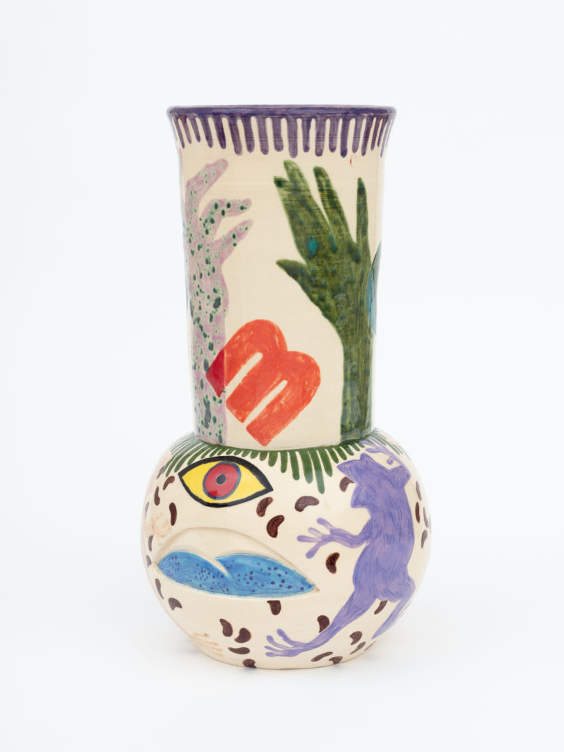 Ein leichthändiges Mixen von Motiven aus unterschiedlichen Kulturen gehört zum Erfolgsrezept von Nadira Husain: Figuren aus den Miniaturen des indischen Mogulreichs stehen bei ihr neben Brezelformen, die die 1980 geborene Französin mit indischen Wurzeln aus ihrer Wahlheimat Berlin kennt. Bâtarde, also „Bastardin“, nennt die Künstlerin ihre Praxis, bei der sie aus der kreativen Kraft des Hybriden schöpft. Ob auf dem Blumenmuster-Untergrund eines Stoffbilds verliebte Kentauren in den semiotischen Dschungel locken oder auf dem Hals einer Vase Hände und Pflanzen emporranken – ein fesselndes Seherlebnis ist garantiert!