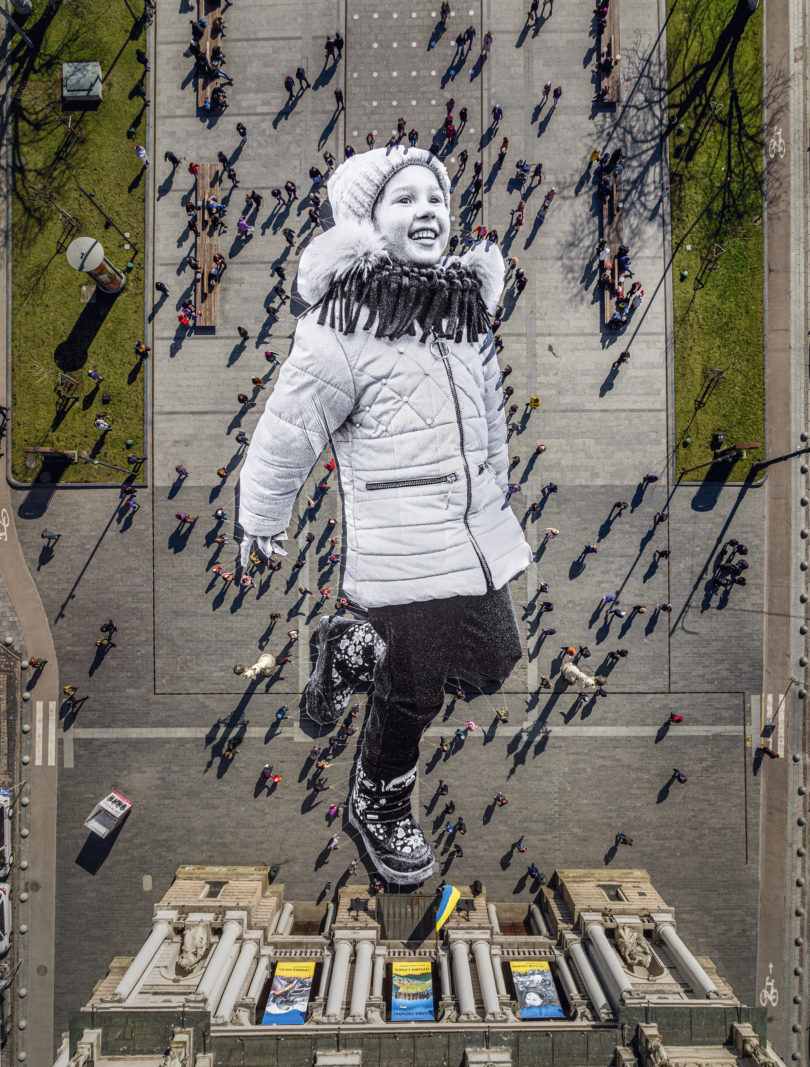 Eigentlich wollte JR seine Aktion nicht noch einmal wiederholen. Zum ersten Mal zeigte der Künstler, bekannt für seine Monumentalporträts im Stadtraum, das 45 Meter große Schwarz-Weiß-Bild der kleinen Valeriia am 14. März in Lwiw in der Ukraine. Über 100 Helferinnen und Helfer waren damals gekommen, um das Banner auf den Straßen zu entfalten: Das Bild des Mädchens, das breit lächelnd auf dem Asphalt hüpft, sollte aus dem Himmel für russische Kampfpiloten sichtbar sein und sie dran erinnern, wessen Leben in diesem sinnlosen Krieg auf dem Spiel stehen. Die Aktion machte Schlagzeilen: JR landete auf dem Cover des Time Magazine und zeigte das Projekt später in Paris, Düsseldorf und zuletzt auf der Biennale in Venedig. Ein halbes Jahr ist seit dem Beginn der russischen Invasion vergangen. Doch weil der Angriffskrieg noch immer andauert, brachte JR das Bild mit nach München. Anlässlich der Eröffnung seiner Retrospektive in der Kunsthalle wurde es auf dem Odeonsplatz entrollt. Als Zeichen der Hoffnung.