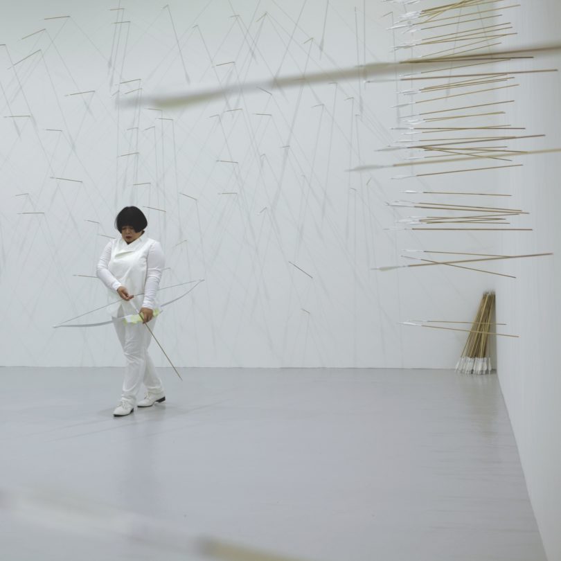 In der Performance „Transaction of Hollows“ (2012), die die Künstlerin in den Räumen des Bonnefantenmuseum wiederholt hat, schießt sie, in Weiß gekleidet, mit einem Bogen Pfeile an die Wände eines bis dahin makelosen Raumes. Die Performance wurde vom Museum aufgezeichnet und ist nun in demselben Raum als Video zu sehen. Langsam und bedächtig bewegt sich die Künstlerin. Das Geräusch der Pfeile, wenn sie in die Wand eindringen, bleibt im Gedächtnis haften. Wo Performance allzu oft in Pathos und Kitsch zu gleiten droht, schafft es Melati Suryodarmo, einen starken Eindruck zu hinterlassen. Hunderte Pfeile evozieren symbolträchtig Bilder von Kriegen, aber lassen auch an eine Armee von Cupidos denken.