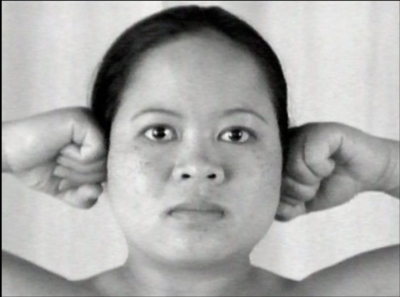In einem kleineren Raum direkt nebenan wird eine der ersten Werke Melati Suryodarmo präsentiert, „Head Piece“, ein Schwarz-Weiß-Video. Hier ist nur der Kopf der Künstlerin sichtbar, sie presst ihre beiden Fäuste an die Seiten ihres Gesichts und dreht diesen hin und her, erst langsam, dann schneller. Zu hören ist „Chinook Whispers“, ein Stück der amerikanischen Musikerin und Performancepionierin Meredith Monk, inspiriert von den Stimmen der First-Nation-Bevölkerung Kanadas. Dabei schaut die Künstlerin direkt in die Kamera, mit einem fordernden, aber auch offenen Blick. Die Arbeit entstand 1997, als Melati Suryordarma noch Schülerin von Marina Abramović in Braunschweig war. Die Nähe zum meditativen Kunstansatz ihrer ehemaligen Professorin ist spürbar. Melati Suryordarma setzt ihren Körper auf eine ähnlich theatralische und dramatische Art und Weise ein.