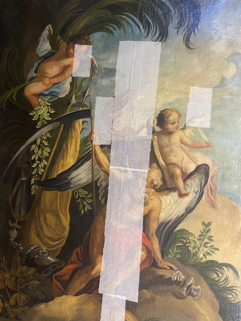Porosität, Zerfall und Konservierung sind die zentralen wiederkehrenden Bildmotive der 16. Lyon Biennale – so werden Ölgemälde an ihren brüchigsten Stellen beispielsweise von Japan-Papier wie von Pflastern abgedeckt. © Felix von Boehm, art/beats
