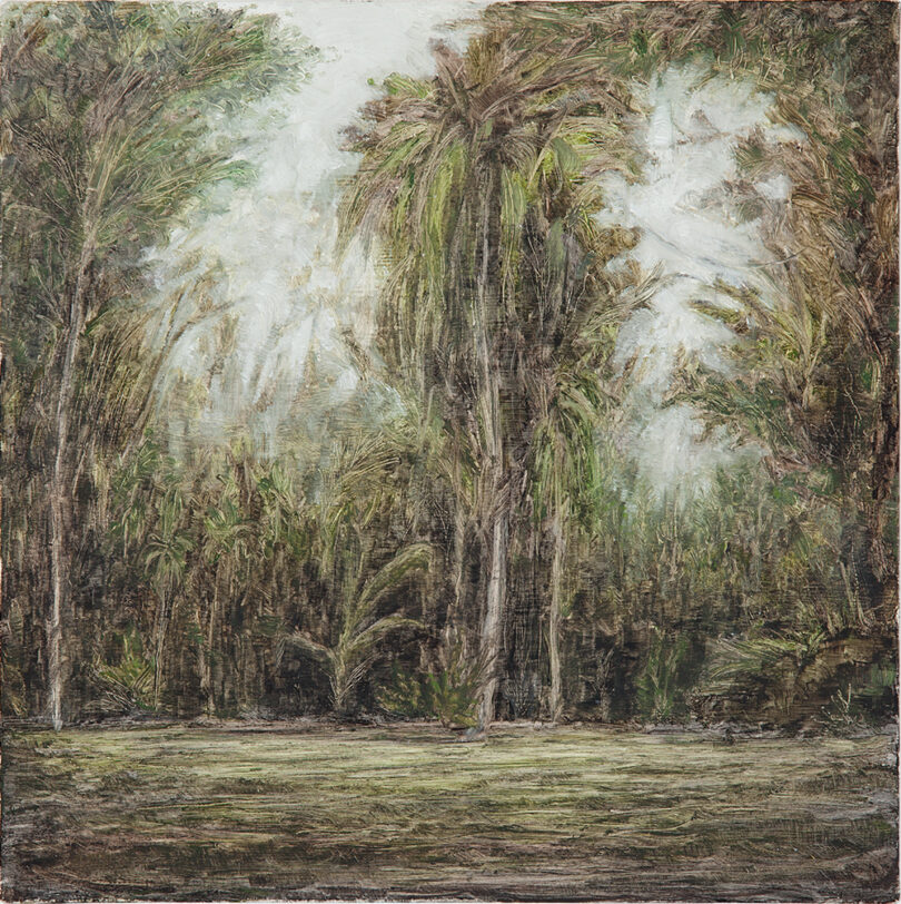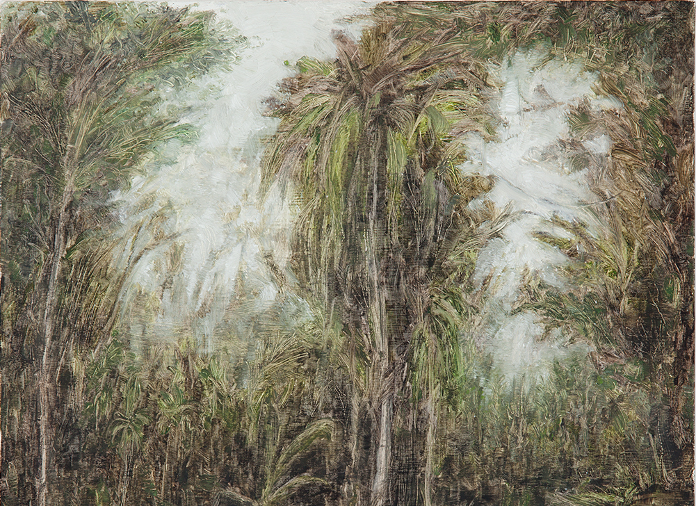 Ja, wir zeigen Bilder des brasilianischen Malers Lucas Arruda, geboren 1983. Er macht seit über zehn Jahren sehr atmosphärische, dichte, kleinformatige Bilder von Wäldern, aus dem brasilianischen Dschungel ganz in der Nähe von São Paulo. Er ist oft in einem Haus direkt am Dschungel, streift durch die Wälder und malt sie anschließend aus dem Gedächtnis.