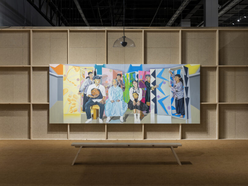 Der nächste Abschnitt, „Ancestral Voices“ beschwört die direkte Verbindung zu unseren Ahnen: Blutrot als Farbe der Wahl auf Abdoulaye Konatés abstraktem Gemälde „The Red Drops“, mit dem der 1953 in Mali geborene Künstler auf die alten Jagdtuniken des westafrikanischen Mandé-Volkes verweist und der Opfer des Terrorismus in der Sahelzone gedenkt, und der schweren Vorhänge, zwischen denen Bakhyt Bubikanovas Bilderserie im Stil traditioneller orientalischer Miniaturen präsentiert wird. Charwei Tsai verbindet taiwanische buddhistische Praktiken mit Versen von Dichterinnen der Sufi-Tradition, während sich die Ainu-Künstlerin Mayunkiki mit den Grenzen befasst, die die Gesellschaft und sie selbst sich wegen ihrer Zugehörigkeit zu dieser indigenen Gruppe Nord-Japans setzen. Die innere Vielfalt hinter der scheinbar so homogenen Fassade von Gesellschaften wie Taiwan oder Japan wird hier selbst für den westlichen Betrachter sichtbar. Diese anderen Traditionen jenseits der Mehrheitsgesellschaft bilden auch den Ausgangspunkt von „The Echo of an Ancient Form of Knowledge“ des guatemaltekischen Künstlers Edgar Calel, der in einem Ritual der Kaqchikel seinen Ahnen die Arrangements koreanischer Früchte geopfert hat.