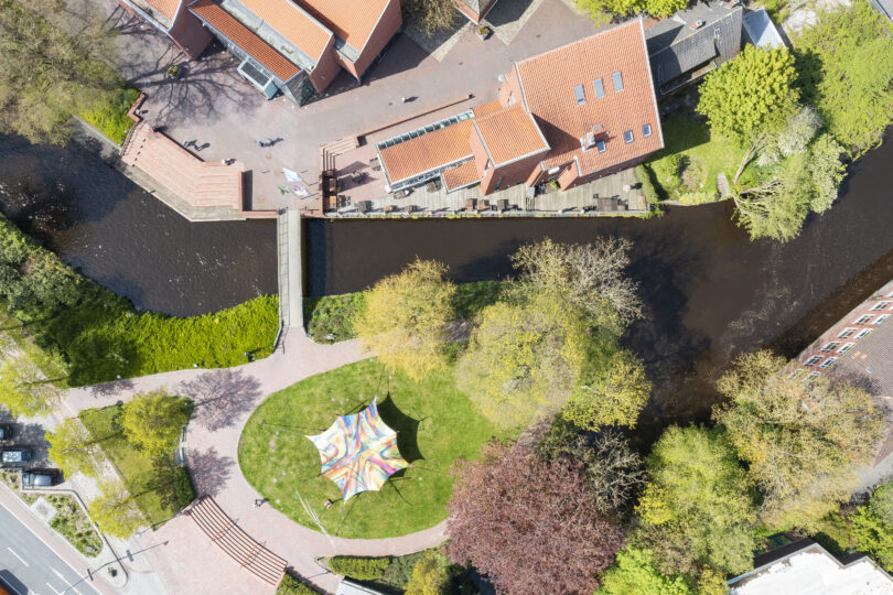Der 1984 in Oldenburg geborene Künstler Jan Pleiten studierte an der Kunstakademie Düsseldorf bei Jörg Immendorff und Tal R. Seine abstrakten Arbeiten zeichnen sich durch kompliziert verflochtene Linien und Formen aus, die zu wahren Farbstrudeln werden, wenn man sie lange genug betrachtet. Der Künstler hat es sich zum Ziel gesetzt, eine begehbare abstrakte Malerei zu schaffen, was aktuell nicht nur im Innen-, sondern auch im Außenbereich der Kunsthalle Emden erfahrbar ist. So steht auf der Grünfläche vor dem Eingang ein von Pleiten gestaltetes Zeltdach, das beim Betrachten in psychedelische Welten entführt. Mehr Infos