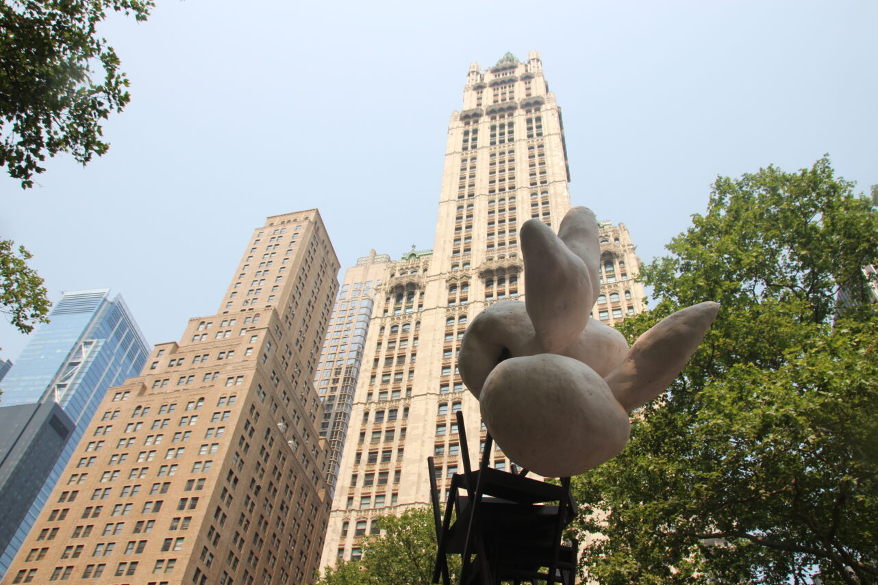 Barlow hatte die Skulpturen aus Stahl und Glasfaser eigens für den City Hall Park an der Brooklyn Bridge in Manhattan entworfen. Sie stellen Alltagsobjekte wie Stühle, Leitern, Klaviere oder Sofas dar, oft übereinandergestapelt und mit einem an Hasenohren erinnernden weißen Objekt verziert. Die Ausstellung «Prank» soll noch bis Ende November zu sehen sein.