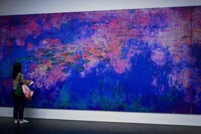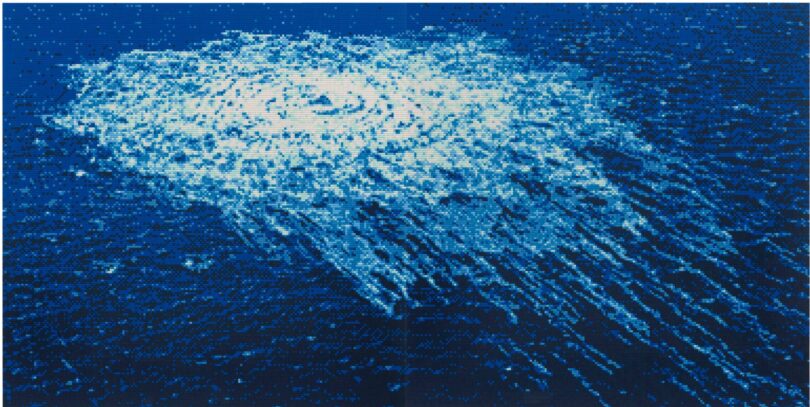 Spektakulär sind vor allem die „Water Lilies #2“ (2022) nach dem Vorbild von Monets „Seerosen“ im MoMA, die mit einer Breite von über 15 Metern in einem eigenen Raum auf drei Wänden über Eck gehängt sind, so dass man mitten im Seerosenteich aus 650.000 Legosteinen steht. So konträr die an Pixel erinnernde Lego-Stecktechnik aus 40 industriell gefertigten Farbbausteinen zu den individuell gemischten Ölfarben Monets erscheint, so verblüffend ist doch die Verführungskraft der Nachahmung, der wir im Strudel der digitale Bilderflut so leicht erliegen. Zumindest kann man im Pointilismus mit seiner additiven Farbmischung noch ein konzeptueller Zwischenschritt auf dem Weg zum digitalen Pixel ausmachen.
