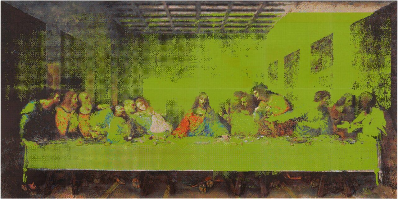 Nun also Kunst über Kunst oder Kunstkopien wie bei Sticksets berühmter Meisterwerke? Leonardos berühmtes Wandgemälde aus dem Dominikanerkloster Santa Maria delle Grazie in Mailand präsentiert Ai Weiwei gleich in drei verschiedenen Farbversionen in Pink, Grün und Weiß, die natürlich auch auf Andy Warhol als Wegbereiter für die massenmediale Verbreitung und Kommerzialisierung der Kunst Bezug nehmen. Die Ambivalenz dieser künstlerischen Haltung greift Ai Weiwei ironisch auf, wenn er der Figur des Judas seine eigenen Porträtzüge verleiht.