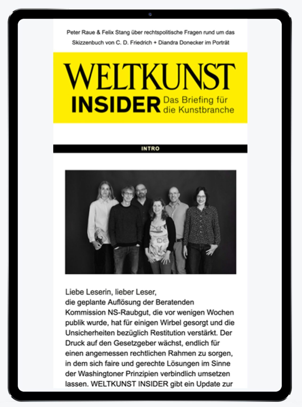 Der WELTKUNST INSIDER Newsletter und Website liefern Ihnen exklusive Einblicke in sämtliche Bereiche des Kunstbetriebs und hält sie regelmäßig auf dem neusten Stand.