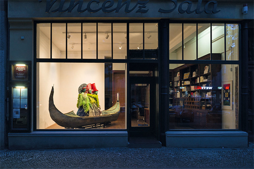Schräg gegenüber hat Florian Schmid in der Potsdamer Straße 102 mit 6 FS. Art einen Showroom in seiner Altbauwohnung. Hier sind zum Gallery Weekend die dynamischen Skulpturen von Wolfgang Flad aufgestellt. Die VictoriaBarim selben Haus sollte man sich unbedingt für den Abend merken. Für eine Pause am Nachmittag bietet sich ein Abstecher nach rechts in die Les Climats ist ein wunderbares Weinlokal mit kleinen Speisen, Zeitschriften und natürlich Kaffee. Die neue Location aus demselben Haus, eine Brasserie, soll bald eröffnen – neben der Victoria Bar! Wir bleiben auf der Pohlstraße und folgen ihr bis zur Hausnummer 64. Die Galeristin TanjaWagner überzeugt hier mit künstlerischen Solitären wie Ulf Aminde, der zum Gallery Weekend neue, gesellschaftskritische Arbeiten zeigt.
