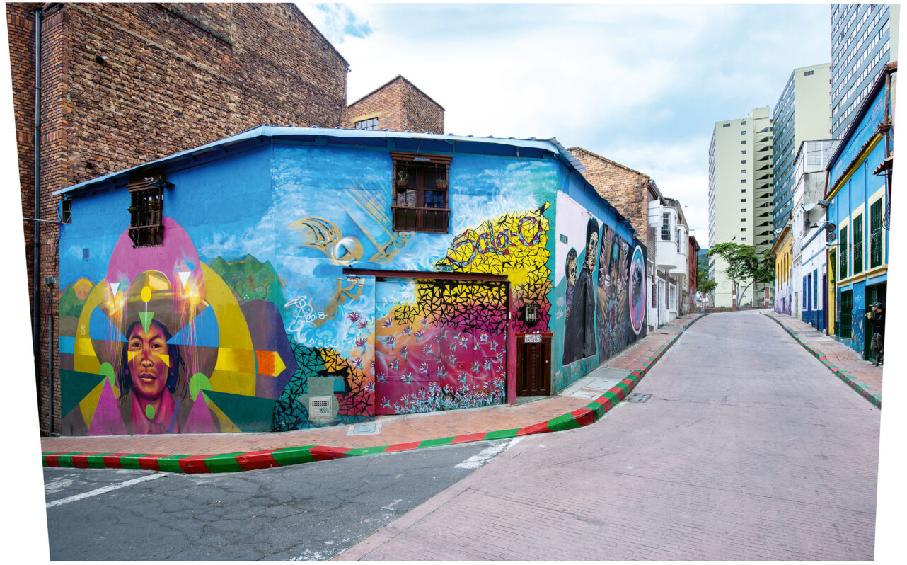 Nach einer Stärkung im Museumscafé müssen wir nicht weit laufen, um unseren zweiten Stopp zu erreichen, denn das Museo de Arte Miguel Urrutia – MAMU befindet sich gleich nebenan. Wir werfen zuerst einen Blick auf die Dauerausstellung, die Arbeiten aus mehr als sechs Jahrhunderten präsentiert, von Malerei über Skulptur bis Fotografie. Die Sammlung umfasst repräsentative Werke lateinamerikanischer sowie europäischer Künstlerinnen und Künstler. Noch bis April 2024 erforscht eine Sonderausstellung die Rolle der indigenen Kulturproduktion in der Kunstgeschichte Kolumbiens. Auf dem kleinen Platz Chorro de Quevedo lassen wir den Tag ausklingen. Da es abends meist etwas kühler wird, nehmen wir Platz im Restaurant El Gato Gris und bestellen „Ajiaco de Bogotá“, eine köstliche Kartoffel-Hühner-Suppe mit Mais und Koriander.