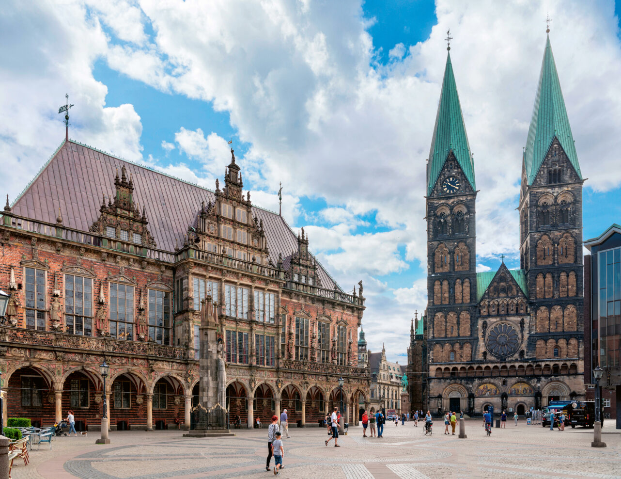 Das Alte Rathaus ist heute eines der bedeutendsten Werke der europäischen Backsteingotik und gehört seit 2004 zum Unesco-Welterbe. Nur bei einer Führung gelangt man in die Obere Halle, Bremens prächtigen Festsaal, und in die Güldenkammer, die der Worpsweder Künstler Heinrich Vogeler um 1905 zu einem Gesamtkunstwerk des Jugendstils machte. Das Highlight ist die vergoldete Ledertapete. Davor richtet sich seit 1404 die Bremer Freiheitsstatue auf, den Blick auf den Dom und die dahinterliegenden Handelswege geheftet. Mit dem zehn Meter hohen steinernen Denkmal für einen Ritter Karls des Großen, ausgestattet mit Schwert und Wappen, signalisierten die Bürger ihre Unabhängigkeit. Den Vorgänger aus Holz ließ der Erzbischof 1366 abbrennen.
