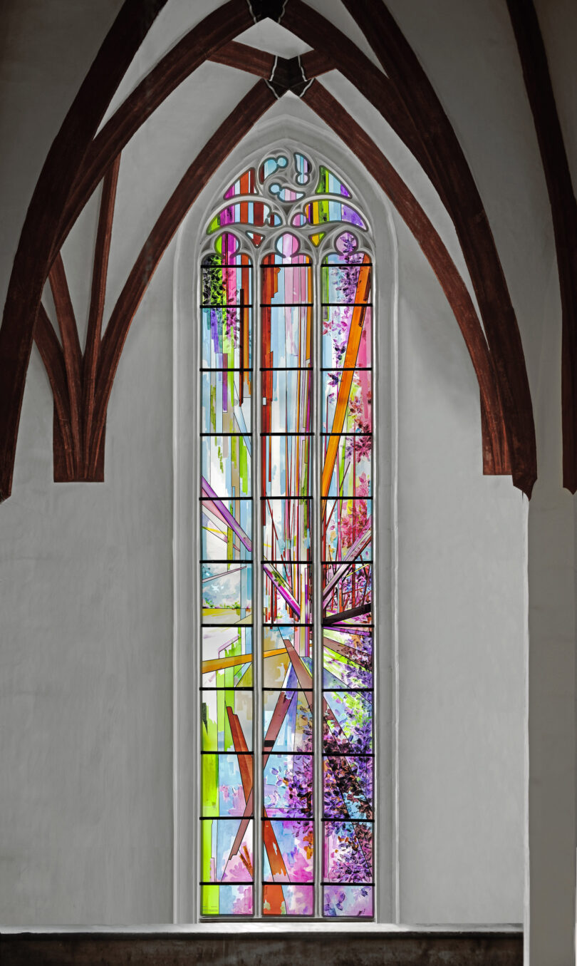 Die Räume bieten eine einzigartige Perspektive auf die gegenüberliegende Thomaskirche. Der spätgotische Bau war von 1723 für 27 Jahre Wirkungsstätte Johann Sebastian Bachs. Sein Amtsantritt wird unter dem Motto „Bach300“ in diesem Jahr groß gefeiert. Wir haben Glück: An diesem Freitag singt der berühmte Thomanerchor in der Motette. Wir bewundern noch das vom Maler David Schnell im Jahr 2009 gestaltete „Friedens-Fenster“: Die aufgelösten architektonischen Strukturen und Landschaftselemente referieren auf das Ende der DDR. Im Herbst 1989 waren Friedensgebete in den Leipziger Kirchen Ausgangspunkt der Montagsdemonstrationen, mit bis zu 300.000 Menschen auf dem Leipziger Innenstadtring.