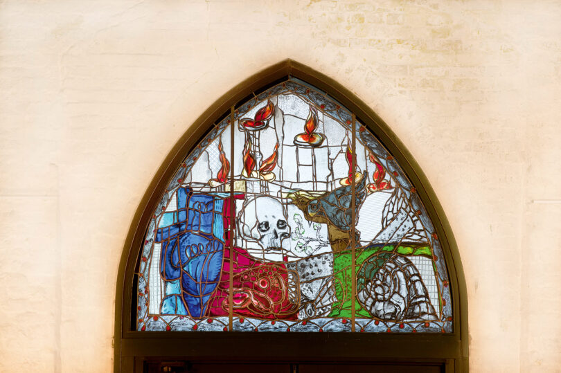 Zu den Schätzen im Inneren gehören die mittelalterliche Ausmalung, die neunzehn prächtigen Kapellen der Lübecker Elite und die Totentanzkapelle. Der Lübecker Maler und Bildhauer Bernt Notke schuf den berühmten Totentanz 1463 für den Beichtraum. An den verlorenen Bilderzyklus mit einem Reigen aus Toten und Lebenden vor der Lübecker Stadtkulisse erinnern moderne Interpretationen wie die beiden hohen Glasfenster des Grafikers Alfred Mahlau von 1956 sowie das farbenprächtige Tympanonfenster des Künstlers Markus Lüpertz von 2002. Im südlichen Chorumgang kommen wir zu Günther Ueckers „Verletzungen – Verbindungen. Vierzehn gebrochene Kreuze“, eine Installation mit Gegenwartsbezug von 2000: beklemmende, in Tuch gewickelte Nagelkreuze, die den Kreuzweg und die Wunden des Zweiten Weltkrieges symbolisieren.