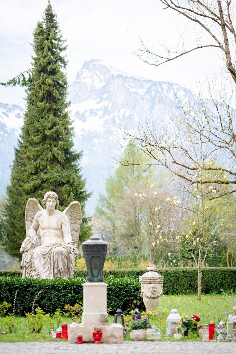 ShareAm dritten Tag schlafen wir vielleicht ein wenig aus und verlassen einmal das UNESCO-Welterbe des „Historischen Zentrums der Stadt Salzburg“. Wir fahren in Richtung Süden, erst ins Nonntal auf einen Besuch in die Kunstgärtnerei Doll, die wahrscheinlich nur in England ihresgleichen findet. Zu Fuß kommen wir auf den Kommunalfriedhof, der mit seiner architektonischen Varianz und Exzellenz an die Giardini in Venedig erinnert.