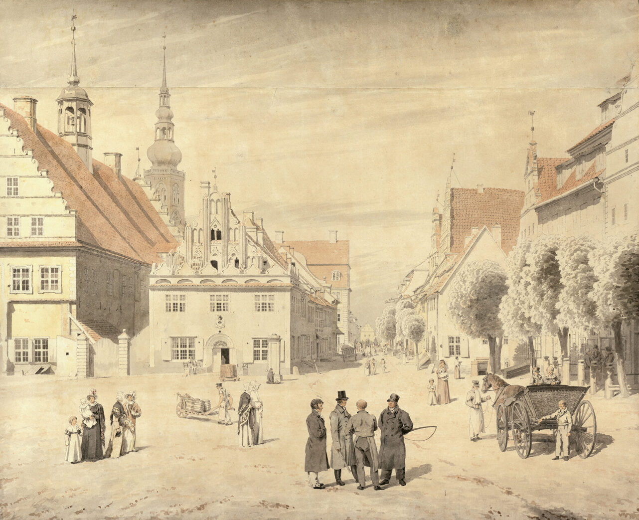 Wir folgen dem Weg durch Greifswald und die Umgebung. Am Museumshafen sehen wir die Segelboote mit ihren Masten, die Friedrich zu seinem Gemälde „Greifswalder Hafen“ inspiriert haben. Eine Tafel des Bildwegs zeigt eine Reproduktion des Werks. Auch der Marktplatz ist eine Station. Die Giebelhäuser, das Rathaus, plaudernde Bürger, alles so wie Friedrich es gemalt hat. Nur die Gehröcke und Pferdekutschen haben Jeans und Fahrrädern Platz gemacht. Das Aquarell „Greifswalder Markt“ ist in der Gemäldegalerie des Pommerschen Landesmuseums zu sehen. Das Bild entstand 1818, während der Hochzeitsreise Friedrichs mit seiner jungen Frau Caroline Bommer. Das Museum feiert das Jubiläumsjahr mit drei aufeinanderfolgenden Sonderausstellungen, die Sammlungsbestände mit hochkarätigen Leihgaben aus nationalen und internationalen Museen zusammenbringen.