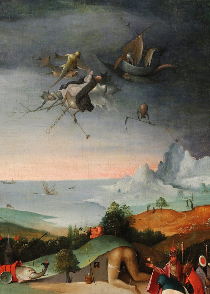 Werkstatt des Hieronymus Bosch: „Die Versuchung des heiligen Antonius“ (Ausschnitt), Triptychon, um 1520 -1550, Öl auf Leinwand auf Holz übertragen, linker Flügel, 92 × 37,5 cm; Foto: Bohdan und Varvara Khanenko Nationalmuseum in Kyjiw