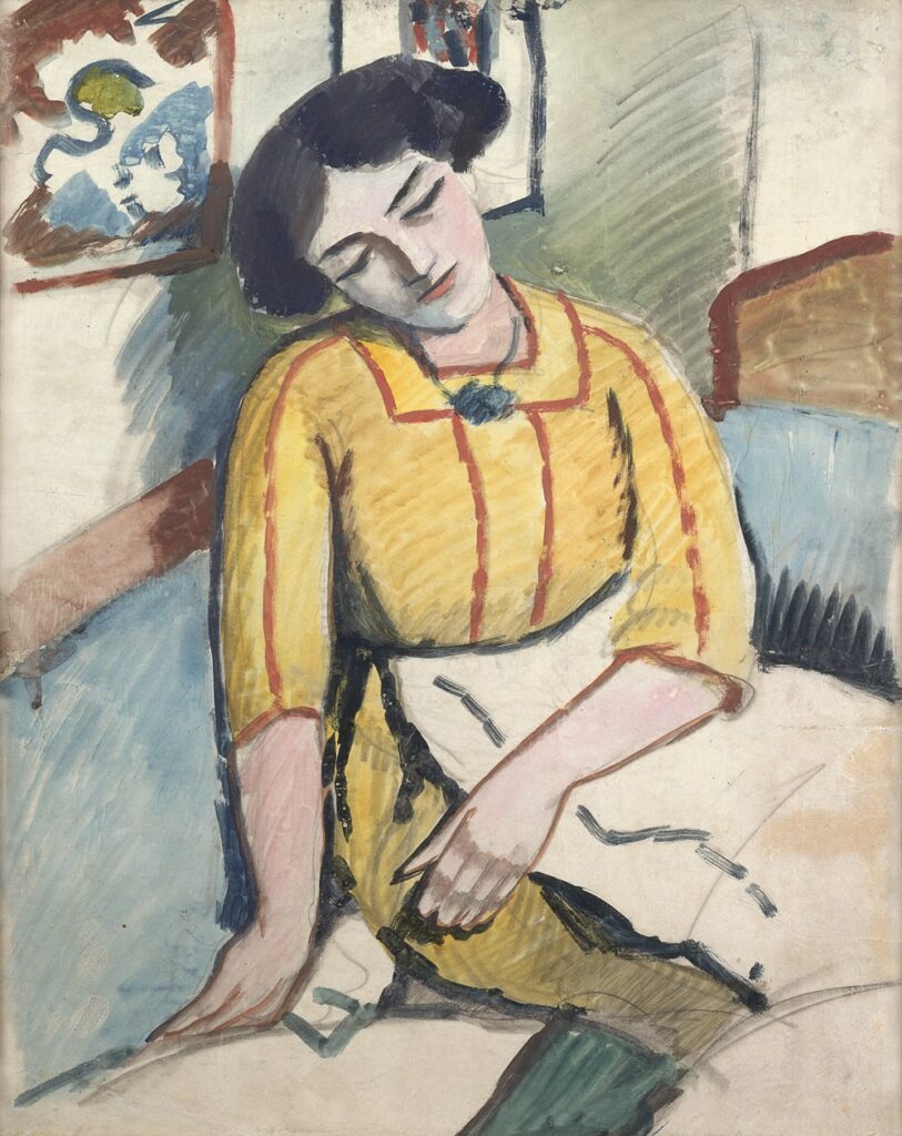 August Macke, Auf dem Sofa eingeschlafen, 1911, Aquarell über Bleistift auf Papier auf Karton, 62 x 49,3 cm, Museo Castello San Materno, Ascona, Fondazione per la cultura Kurt e Barbara Alten