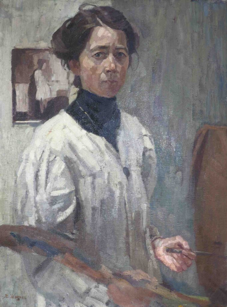 Helene Wagner, Selbstporträt im Malkittel, undat., Bund Bildender Künstlerinnen Württembergs e.V.
