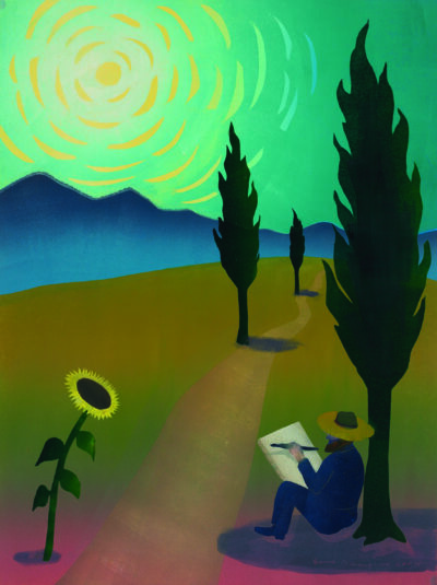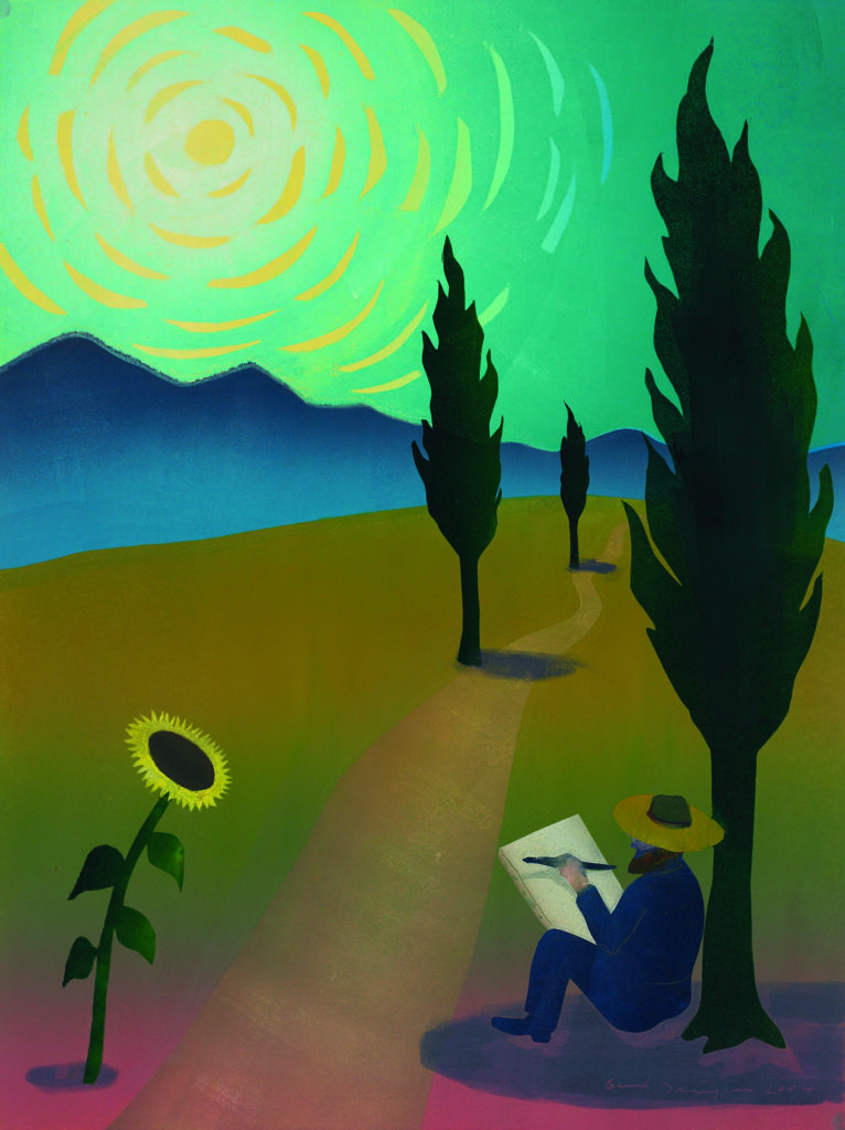 Vincent malt Sonnenblume mit links, Hom- mage an Van Gogh, 2004, Monotypie, 64 X 48 cm, Besitz des Künstlers