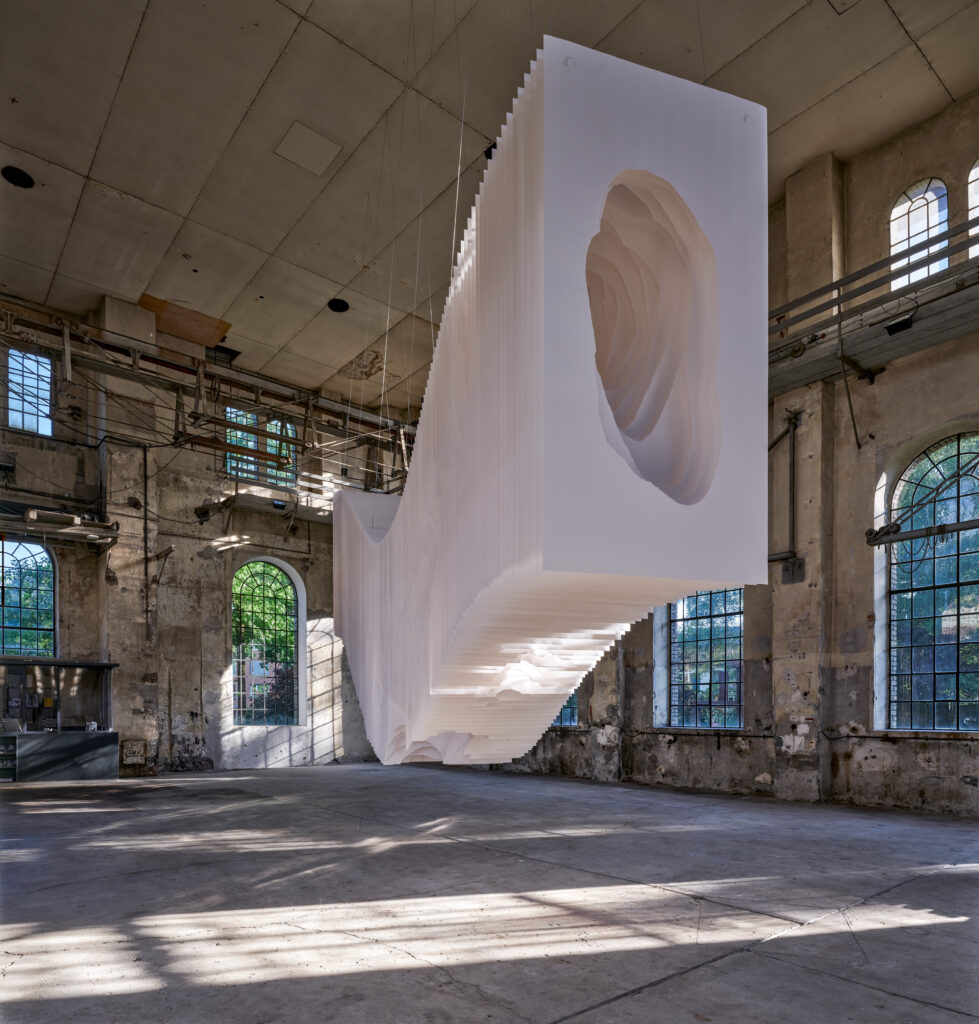 Angela Glajcar lässt aus Papier raumgreifende Arbeiten von scheinbarer Leichtigkeit und poetisch anmutender Plastizität entstehen. „FLASHBACK“ bringt zwei Werke der Serie „Terforation“ in ein spannendes Wechselspiel, in welchem die Konstruktion und Dekonstruktion der architektonisch strukturierten Formen durch Bewegung und natürlichen Lichteinfall erfahren werden können. Die historische Architektur der Ausstellungshalle des Kunstraum Dornbirn bietet dafür ein einmaliges Setting.