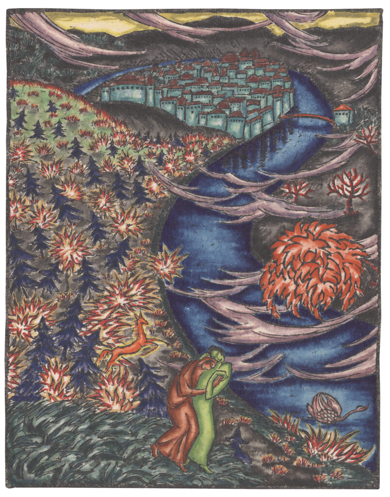 Hedwig Kruse: Flusslandschaft, 1920, Holzschnitt, koloriert, 27 x 22 cm, Kulturstiftung Sachsen-Anhalt, Kunstmuseum Moritzburg Halle (Saale), Repro: Kulturstiftung Sachsen-Anhalt