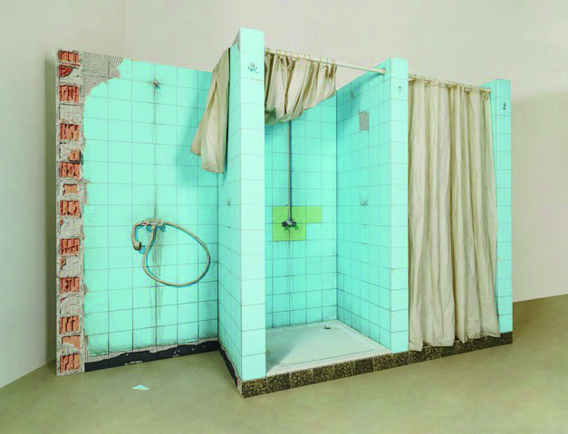 © Stefan Bircheneder: Duschkabinen, 2023, Öl und Acryl auf Leinwand, Textil ; Stefan Bircheneder